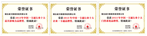 煙臺(tái)威爾公司榮獲由中國(guó)一卡通網(wǎng)主辦、浙江正元智慧科技股份有限公司贊助的“2013(第四屆)中國(guó)一卡通行業(yè)年度評(píng)選”中的三項(xiàng)大獎(jiǎng),分別是:"2013中國(guó)一卡通行業(yè)十大最具影響力品牌"、"2013中國(guó)一卡通行業(yè)十大企業(yè)一卡通品牌"、"2013中國(guó)一卡通行業(yè)十大門禁系統(tǒng)品牌"。