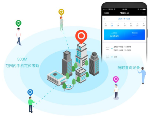 在公司房源300米的范圍內(nèi)即可進行手機定位考勤,不必走遠路尋找考勤終端進行考勤,節(jié)約了員工的時間,提升了員工幸福感,同時公司的管理員定位內(nèi)勤范圍,員工進入考勤區(qū)域允許打卡,員工手機打卡,隨時查詢記錄,外出人員可以進行手機打卡,公司人員所在位置清晰,管理有序。