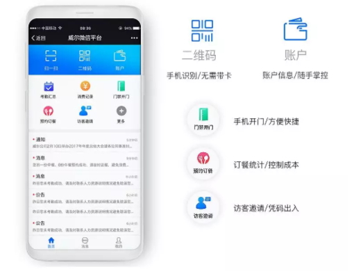 威爾數(shù)據(jù)的手機移動端依托微信服務(wù)號可以做到每個企業(yè)獨有一個客戶端的目標,這樣的設(shè)計防止了公司機密數(shù)據(jù)外泄,針對用戶的痛點客戶端集成了二維碼掃碼考勤、手機定位考勤、充值消費方便快捷、訪客邀請、訂餐統(tǒng)計控制成本、手機門禁開門、多級審批七大功能于一體進一步減輕企業(yè)管理的成本與負擔。