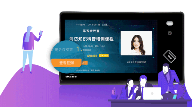 可通過系統(tǒng)和班牌進(jìn)行多種形式的會議預(yù)約操作,會議開始后參會人員可通過刷卡、二維碼和人臉等多種方式簽到。