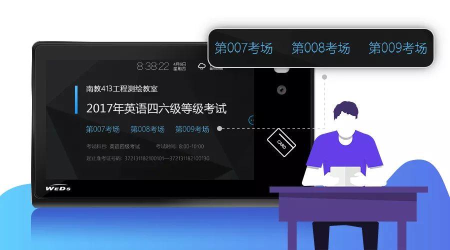 系統(tǒng)根據(jù)排考信息,在考試周的時(shí)候,智能終端自動(dòng)轉(zhuǎn)換為展示考場信息,系統(tǒng)支持一教室多考場設(shè)置,除考場之外還可展示考務(wù)辦公室、試卷分發(fā)室等其余信息。