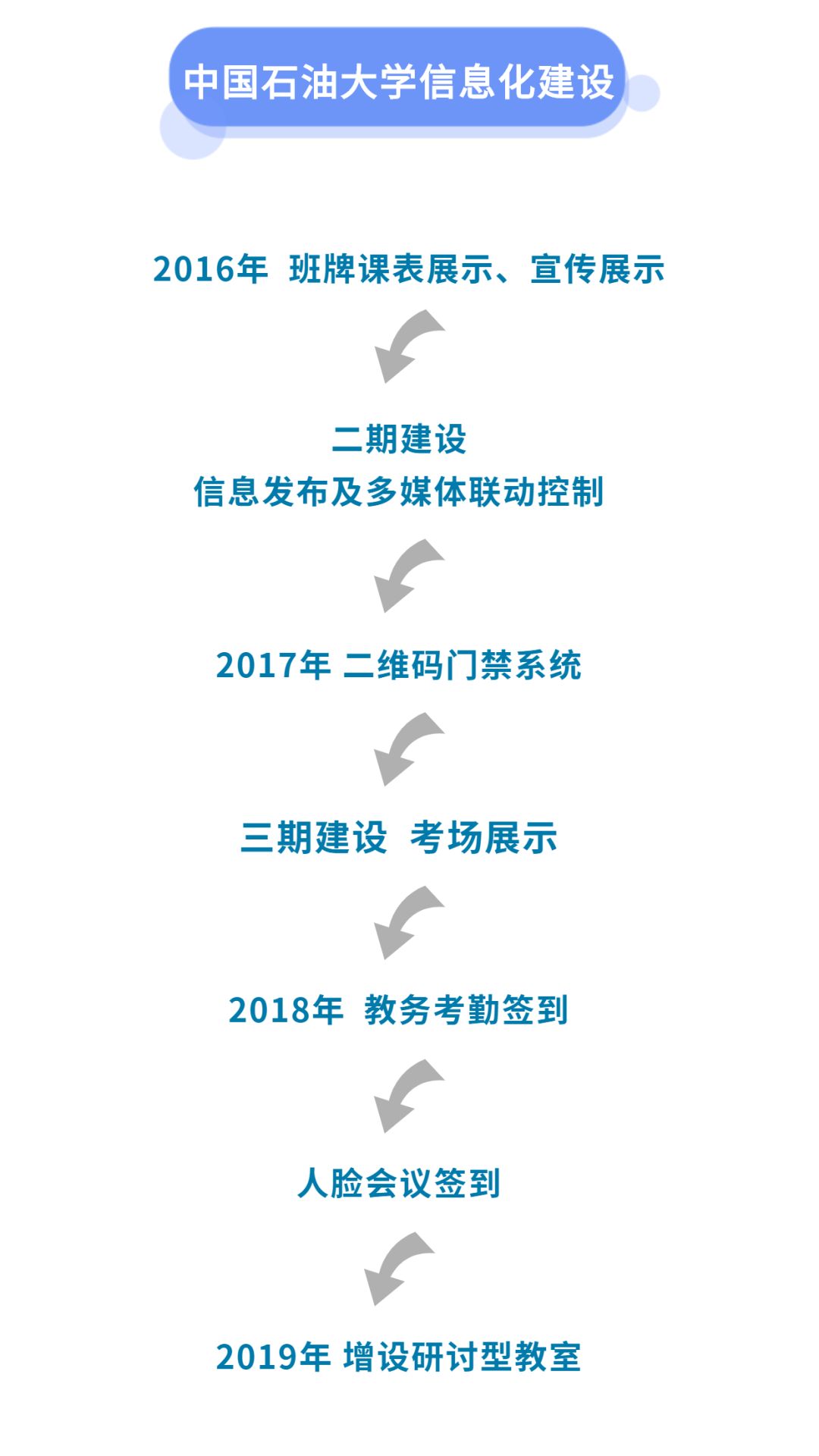 2016年,石油大學(xué)初始建設(shè)此系統(tǒng),部署450臺10英寸班牌在多媒體教室、47臺21.5英寸班牌在實驗室、機房等場所,覆蓋教學(xué)樓、實驗室共八棟。在智慧化進行課表展示和宣傳展示的同時,增強石油大校園數(shù)字化建設(shè),有效提升學(xué)校形象。