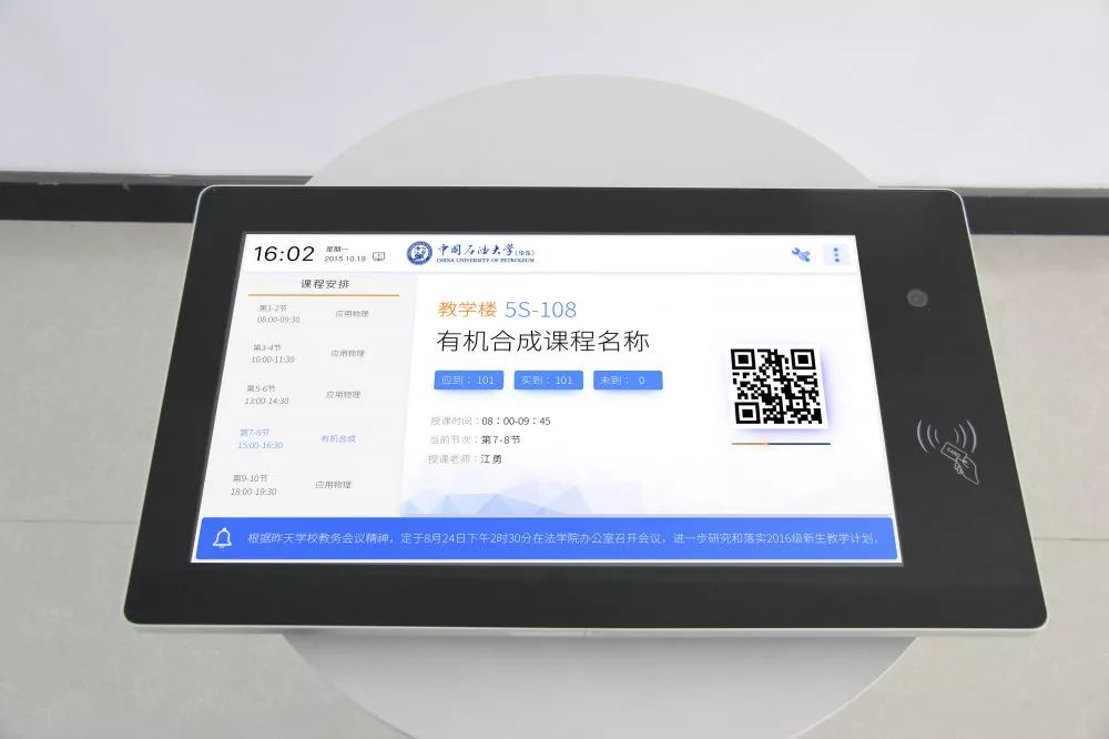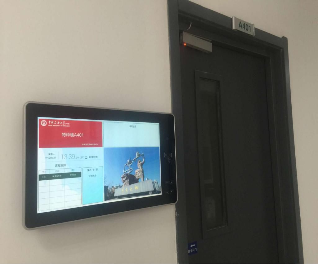2019年國慶期間,中國石油大學(xué)新增9間研討型教室,增設(shè)18臺班牌設(shè)備,用于聯(lián)動課表及預(yù)約系統(tǒng)進行門禁控制,實現(xiàn)刷卡開門、掃碼開門及人員簽到,以實際行動致力于加快建設(shè)“高校智慧教室”。