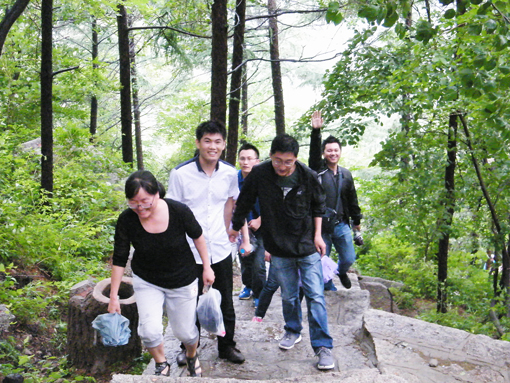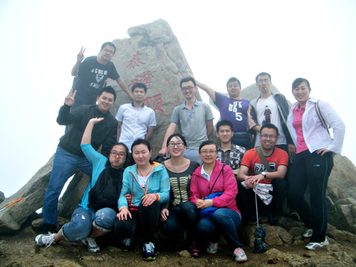 天公不作美,下起雨來,但這并沒有影響大家登山的熱情。員工們一個(gè)跟著一個(gè),三五結(jié)隊(duì)有說有笑的向山頂進(jìn)發(fā)。途中大家相互幫扶,互相加油鼓勁。登山的疲憊被這歡樂、和諧的氣氛沖到了山下,100多位同事的歡笑聲縈繞著整個(gè)泰礴頂。站在泰礴頂上,大家的衣服都浸濕了,分不清身上是雨水還是汗水,已然沒有人去思考這個(gè)問題了,因?yàn)榇蠹叶汲两诘巧享敺宓南矏傊?,這勝利感大有戰(zhàn)勝珠穆朗瑪峰的勢頭。