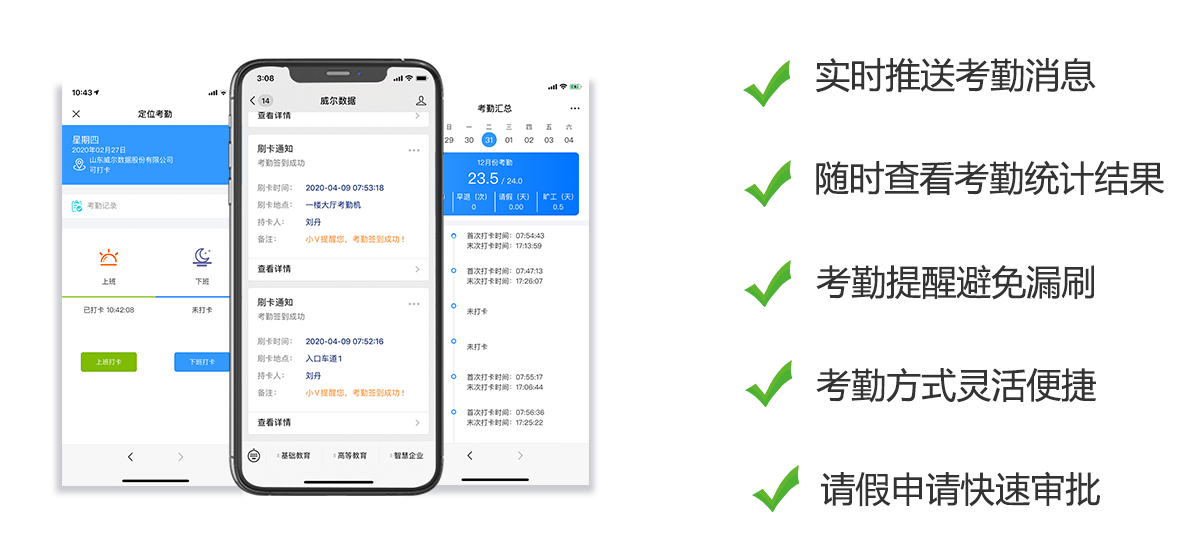 員工考勤記錄實(shí)時(shí)上傳,智慧企業(yè)微信平臺(tái)進(jìn)行考勤信息推送。考勤規(guī)則可設(shè)置提醒,避免漏考勤。