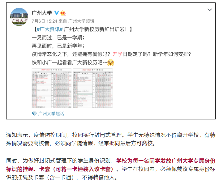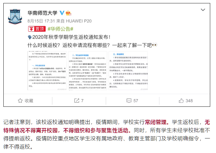 中南財經(jīng)政法大學(xué)、華南理工大學(xué)、中山大學(xué)、陜西師范大學(xué)等學(xué)校也發(fā)布通知,將在秋季開學(xué)后繼續(xù)實行校園封閉管理。