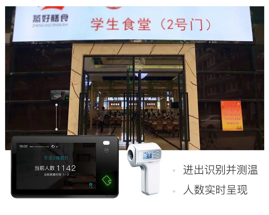 通過在餐廳門口分別設(shè)立進(jìn)、出智能終端,人員進(jìn)出均識別并測溫,餐廳區(qū)域內(nèi)人數(shù)實時更新呈現(xiàn),有效保證人流密度不過高,降低因堂食就餐帶來的傳播風(fēng)險。