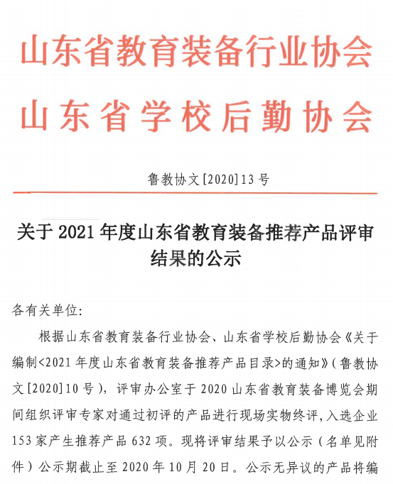 近日,《關(guān)于2021年度山東省教育裝備推薦產(chǎn)品評審結(jié)果的公示》發(fā)布,共在全國范圍內(nèi)入選企業(yè)153家產(chǎn)生推薦產(chǎn)品632項,確定2021年度推薦產(chǎn)品名單。