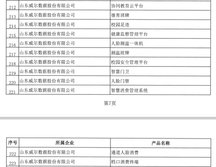 在此次評選中,山東威爾數(shù)據(jù)的協(xié)同教育云平臺、德育班牌、校園足跡、健康監(jiān)察管理平臺、人臉測溫一體機、測溫班牌、校園安全管理平臺、智慧門衛(wèi)、人臉門禁、智慧消費管理系統(tǒng)、通道人臉消費、檔口消費終端等12款產(chǎn)品成功入選2021年度山東省教育裝備推薦產(chǎn)品目錄。