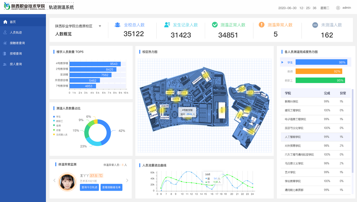 通過后臺可清晰查看全校在校師生狀態(tài)、測溫完成情況、場所通行高峰及任意區(qū)域的實時人員數(shù)量,實時呈現(xiàn)校園內(nèi)各種運行數(shù)據(jù),方便管理者掌控。