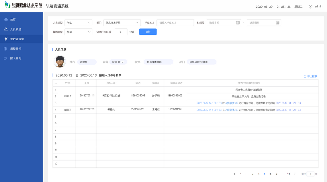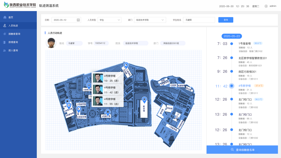 校內(nèi)個人軌跡瞬時呈現(xiàn),每條進出記錄均對應密切接觸人員數(shù)量,一鍵即可查詢接觸者名單,有效降低校方防疫工作壓力。