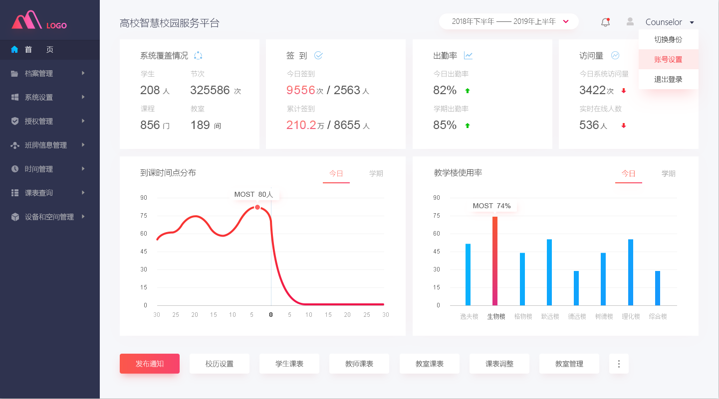 平臺包含教務考勤、教務考試、會議管理、請假出入、宿舍進出、實時門禁、訪客進出、測溫軌跡等多種應用管理,以統(tǒng)一性為前提,快速幫助高校實現(xiàn)行為數(shù)據(jù)化、數(shù)據(jù)服務化、服務智慧化。