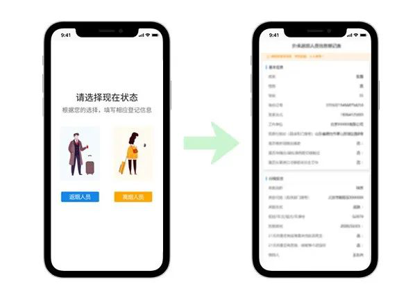 人員返鄉(xiāng)、離鄉(xiāng)前,使用微信掃碼進(jìn)入系統(tǒng)進(jìn)行申報填寫。