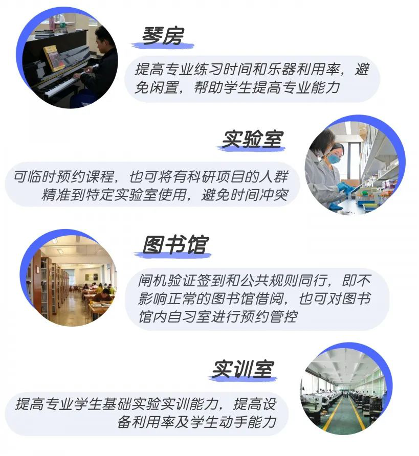 針對高校自習室、實驗室、琴房等需要預約使用的場所,融合教學與學習使用需求,提供隨時隨地的自助化、靈活化的預約方式,幫助學校合理利用教學資源,提高管理效率。