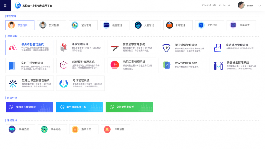 高校UIP平臺(tái)是以人臉識(shí)別技術(shù)為核心,包含教務(wù)考勤、教務(wù)考試、會(huì)議管理、請假出入、宿舍進(jìn)出、實(shí)時(shí)門禁、訪客進(jìn)出、測溫軌跡等多種應(yīng)用管理的高校統(tǒng)一身份識(shí)別應(yīng)用平臺(tái)。