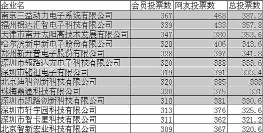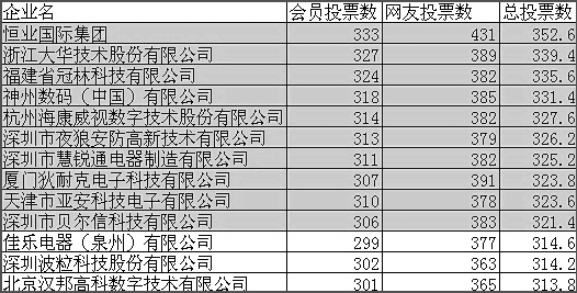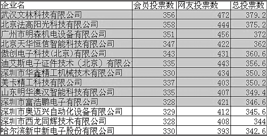 目前,經(jīng)過2個(gè)月的激烈競(jìng)爭(zhēng),通過廣大網(wǎng)友的熱心參與,本次評(píng)選活動(dòng)已經(jīng)圓滿拉下帷幕。下面,是本次評(píng)選活動(dòng)的最終投票結(jié)果。(注:總票數(shù)=會(huì)員投票*0.8+網(wǎng)友投票*0.2,只選取部分排名靠前企業(yè)數(shù)據(jù))