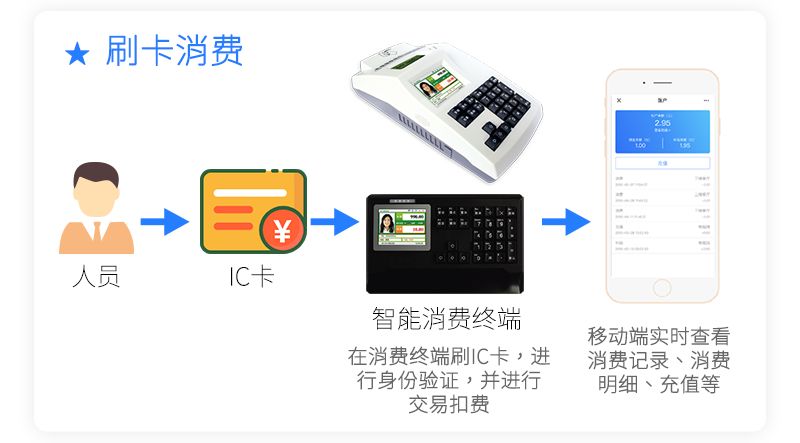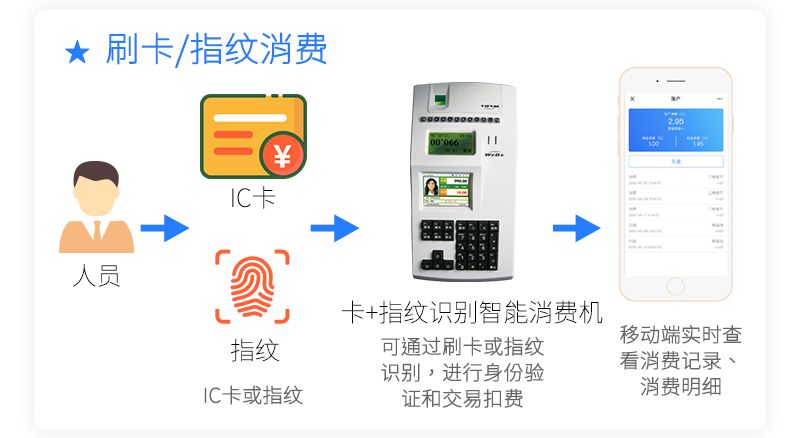 持卡人開通電子錢包賬戶后,即可消費(fèi)電子錢包余額。系統(tǒng)支持IC卡、NFC手機(jī)卡、2.4G手機(jī)卡、指紋、二維碼、人臉等多種識別方式